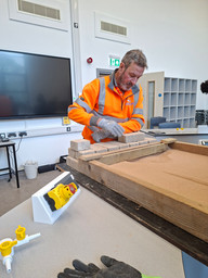 James Gill from Seer Construction delivered a practical paving session, explaining why solid foundations are essential before laying bricks and demonstrating how herringbone patterns are formed. The session felt particularly relevant as Seer had previously completed the herringbone pathway outside the school, helping pupils connect the lesson to their everyday surroundings.